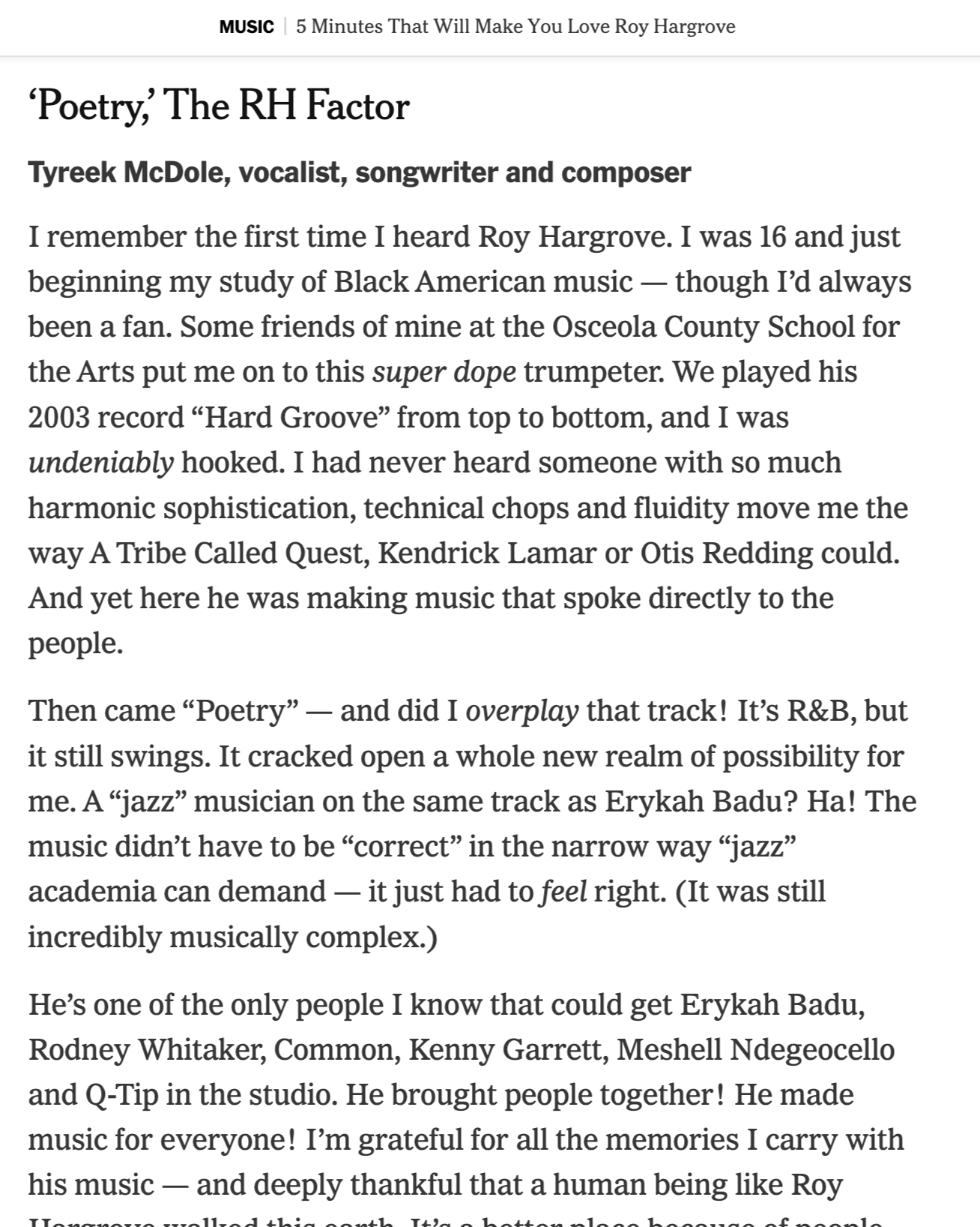 Tyreek pays his respects to one of his greatest musical inspirations, Roy Hargrove, in the New York Times.